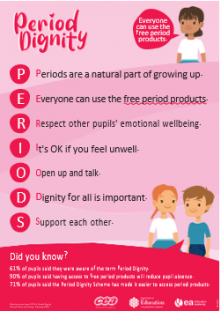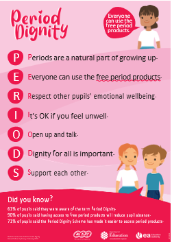 The period dignity programme compliments work being carried out in RE and PDMU lessons are centred around growth, understanding and developing knowledge and understanding of ourselves and others.